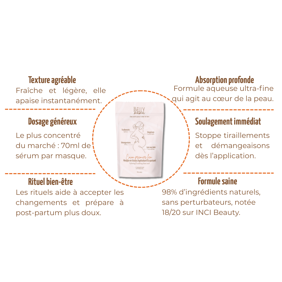 Bellymama est née de cette expérience : une formule saine, naturelle et efficace, pensée pour apaiser, hydrater et accompagner chaque maman dans cette étape unique.